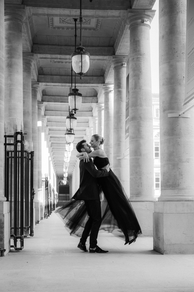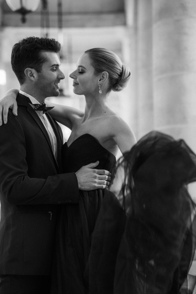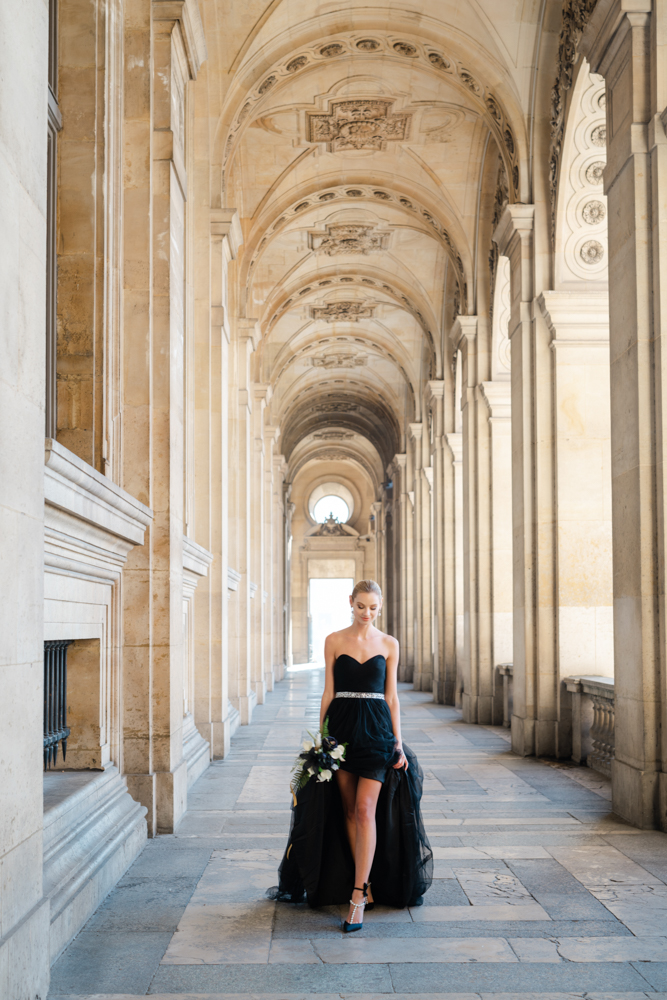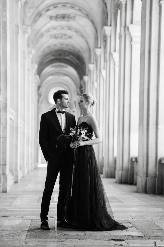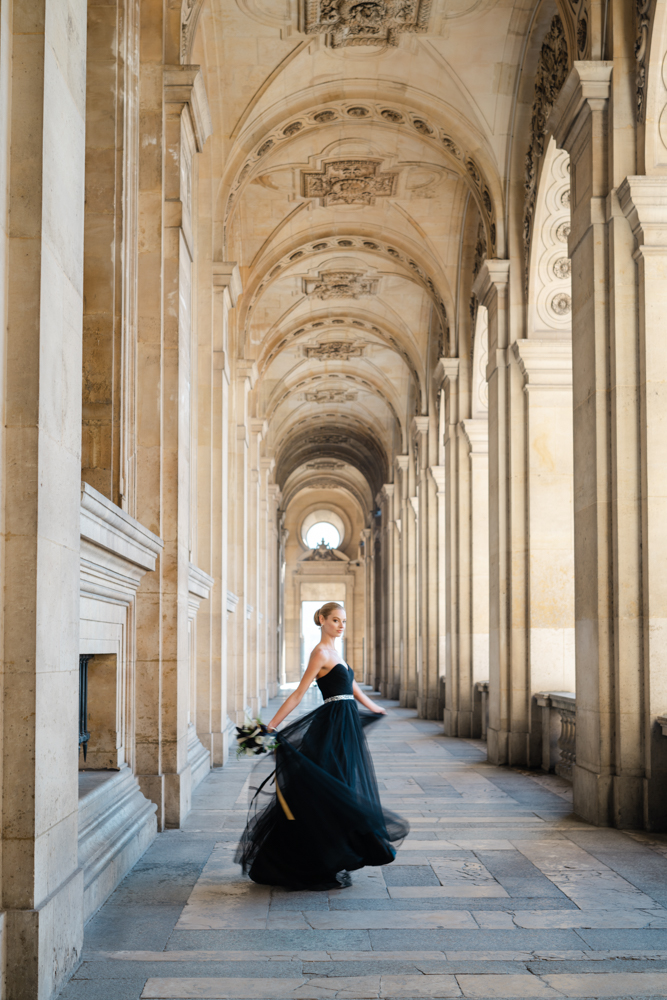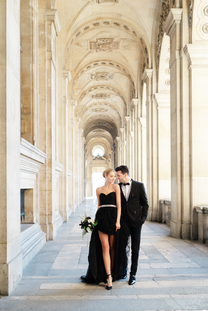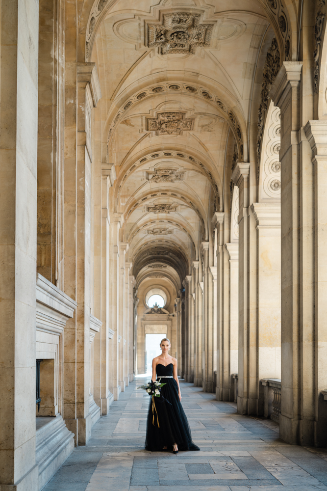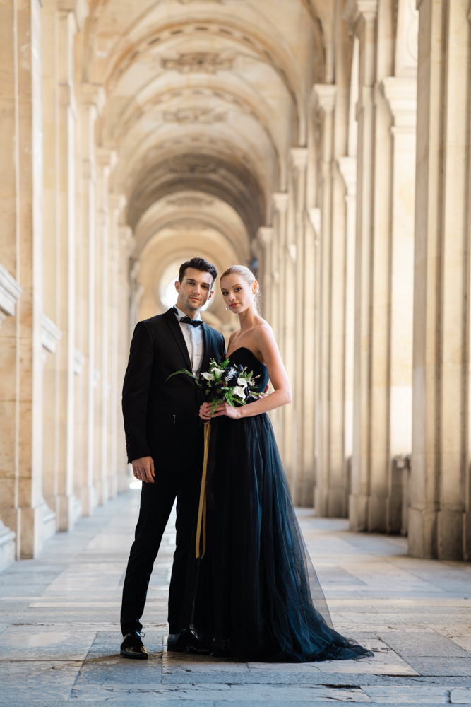 The bride, defying convention with grace, dons a breathtaking black dress paired with Bella Belle shoes, setting the stage for a celebration that breaks free from the ordinary. The love story begins to unfold on the cobblestone streets of Paris, with a captivating photo walk through iconic spots like the Louvre passages and Palais Royal gardens, each frame weaving a tale of passion and elegance.