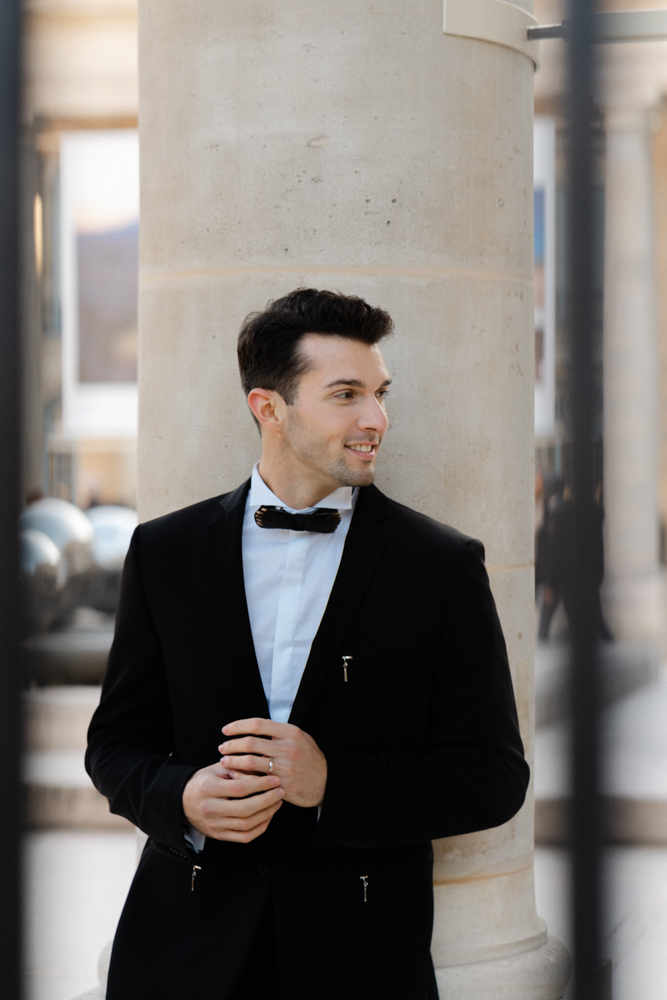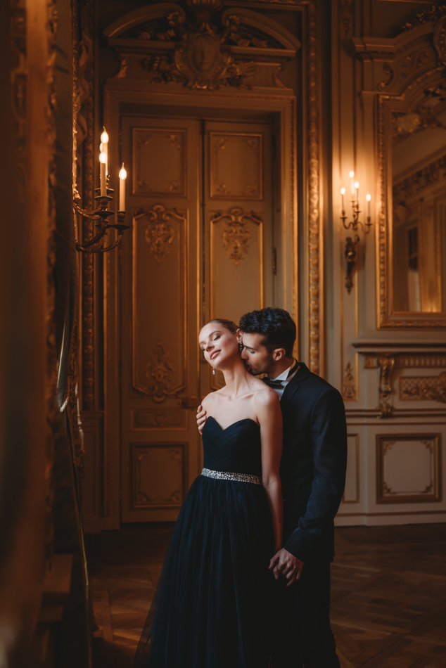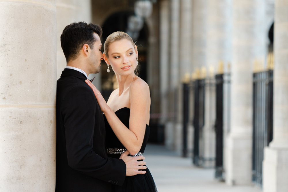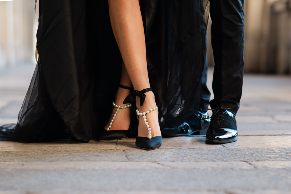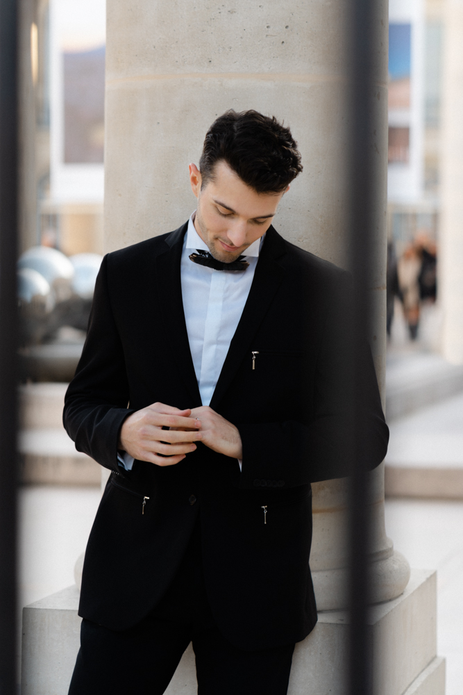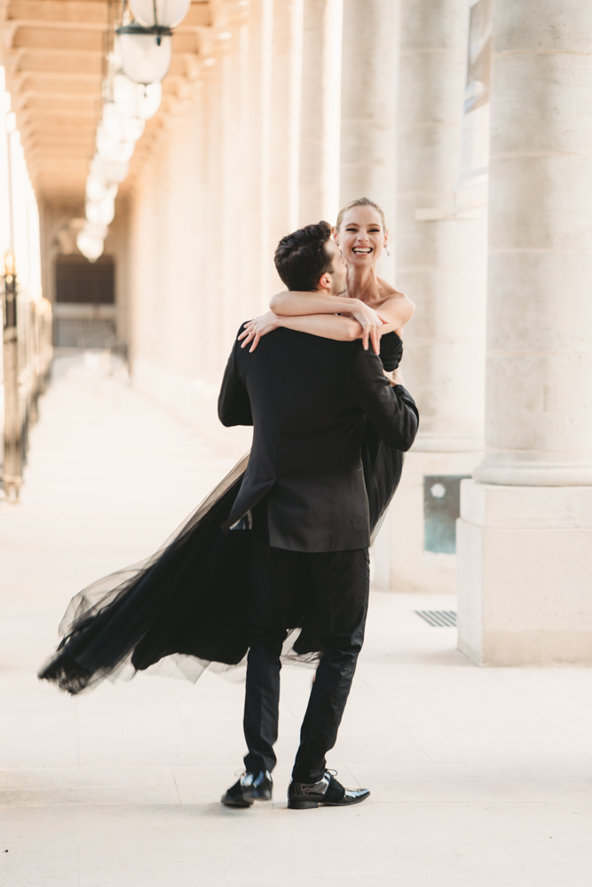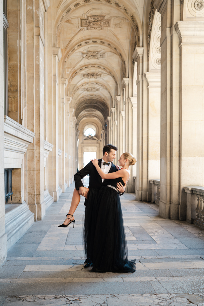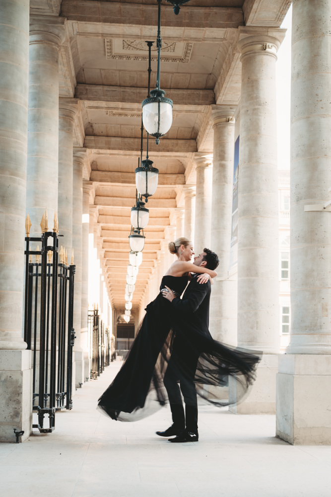 The bride, defying convention with grace, dons a breathtaking black dress paired with Bella Belle shoes, setting the stage for a celebration that breaks free from the ordinary. The love story begins to unfold on the cobblestone streets of Paris, with a captivating photo walk through iconic spots like the Louvre passages and Palais Royal gardens, each frame weaving a tale of passion and elegance.