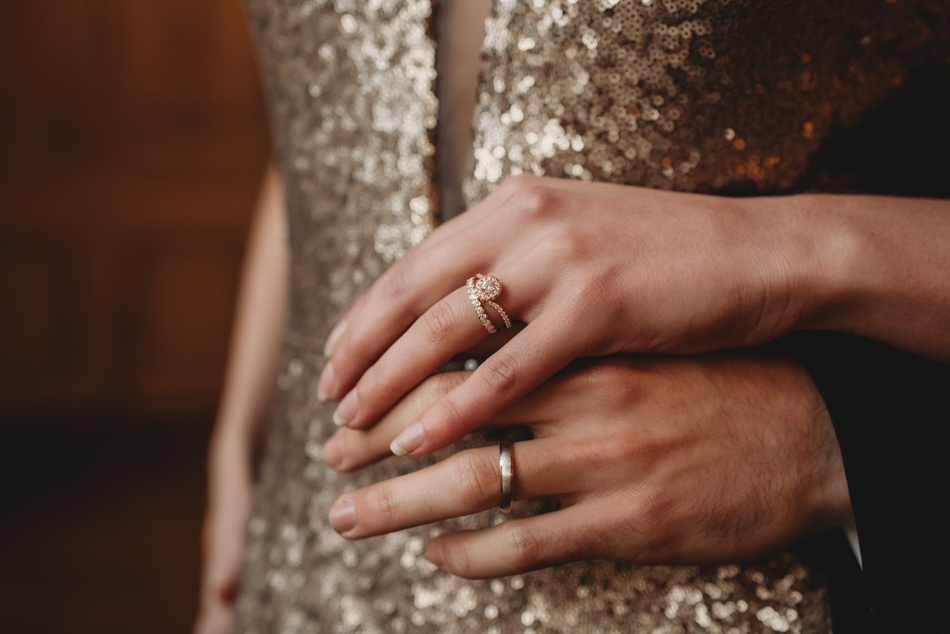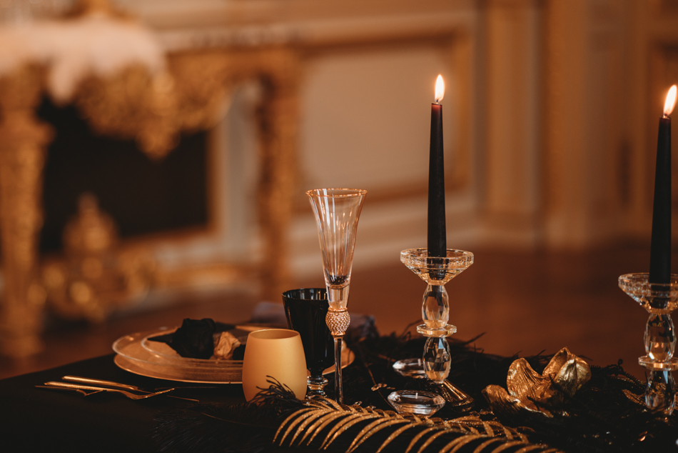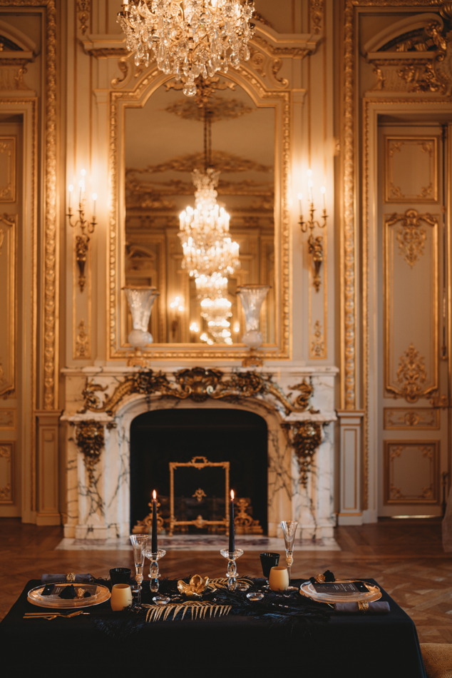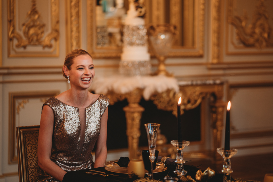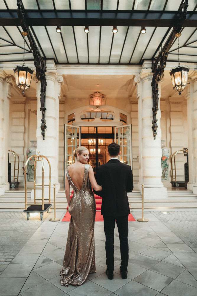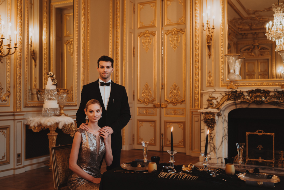The grandeur continues at Shangri-La, where an intimate dinner awaits in the Grand Salon. The bride’s transformation is nothing short of enchanting, as she graces the setting in a golden sequin fitted dress from Rosa Clara. The table for two, adorned with a lavish display of gold, black, and sparkles by the talented Jo Braham, becomes a visual feast that mirrors the couple’s extraordinary love.